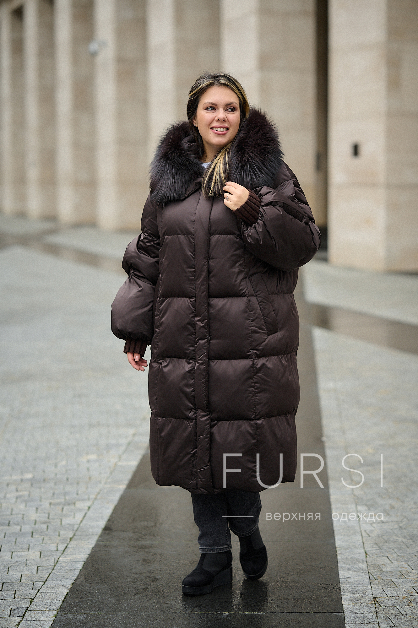 Пуховик оверсайз с вязаными рукавами, темный трюфель с чернобуркой длинный