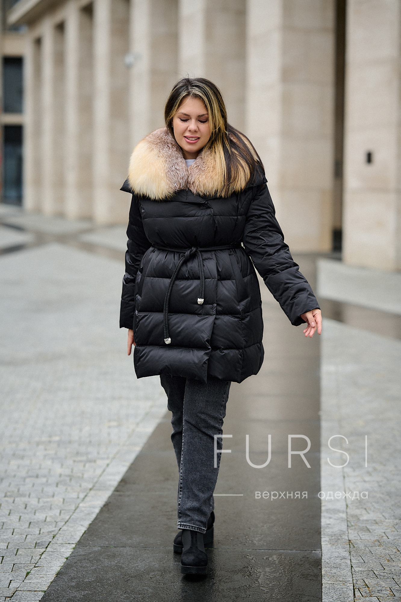 Пуховик без капюшона с пояском, черный с мехом исландской лисы