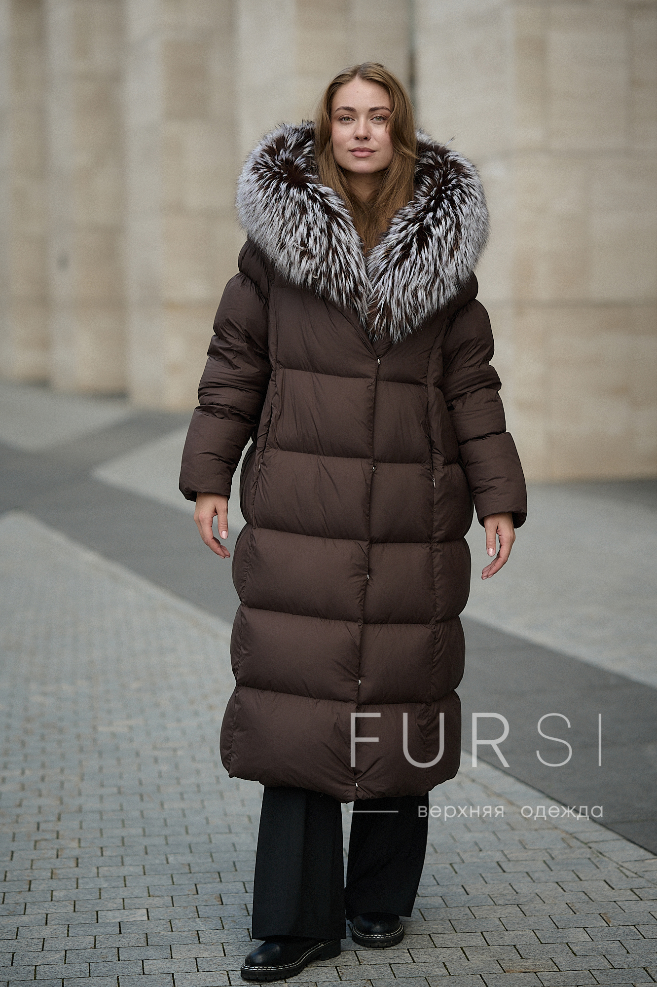 Длинный пуховик кокон шоколадный с мехом тонированной чернобурки