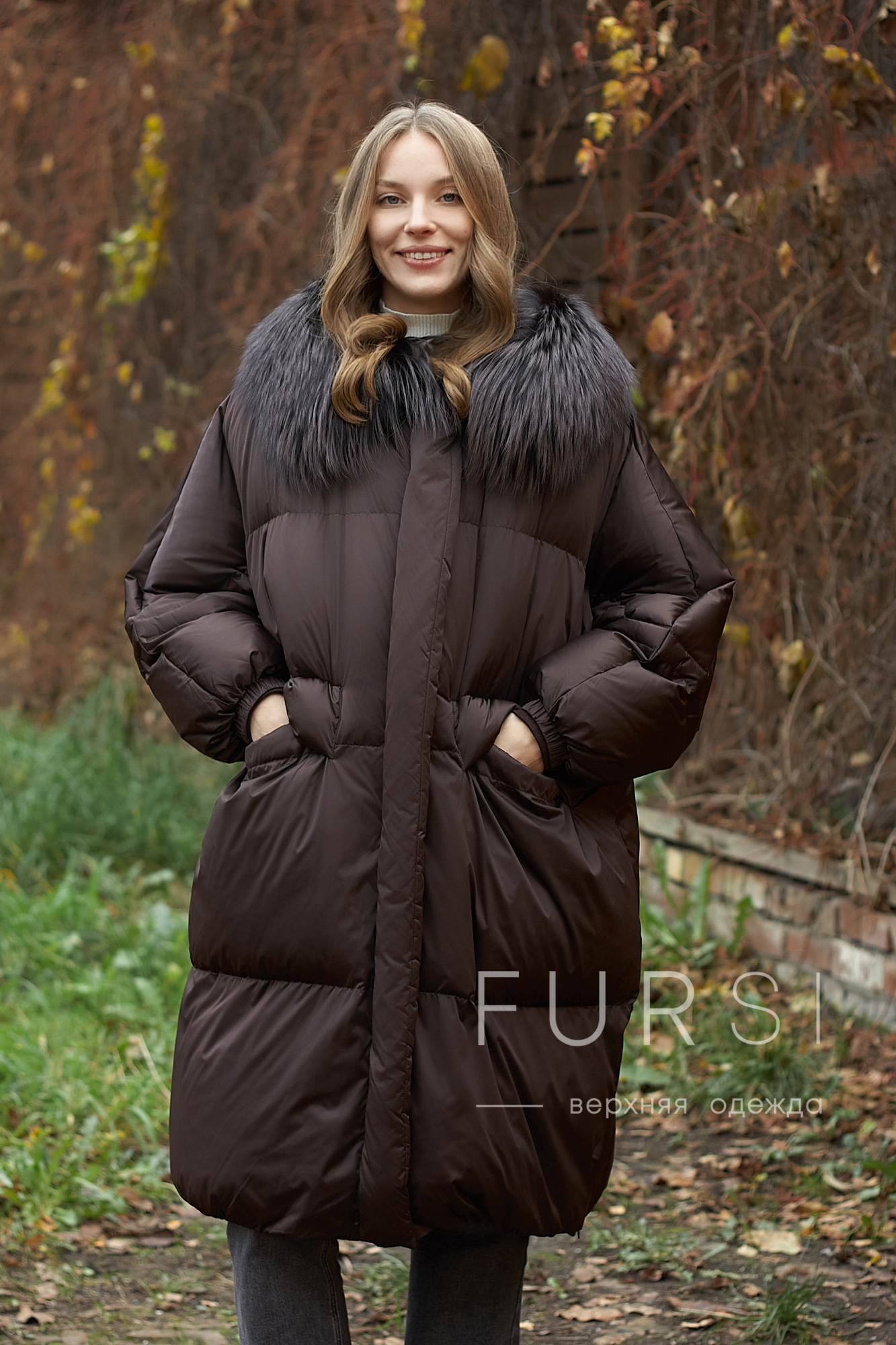 Пуховик оверсайз летучая мышь шоколадный трюфель с мехом чернобурки в тон