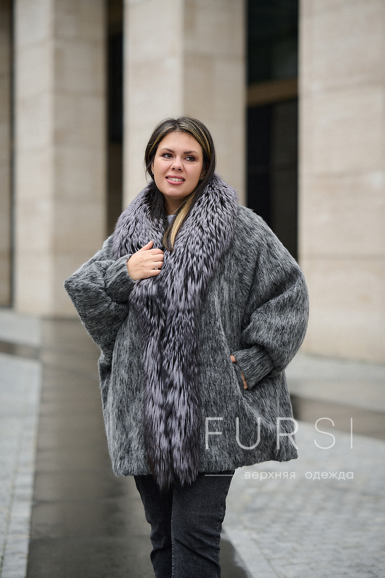 Пальто-пуховик из шерсти, цвет графит с мехом чернобурки