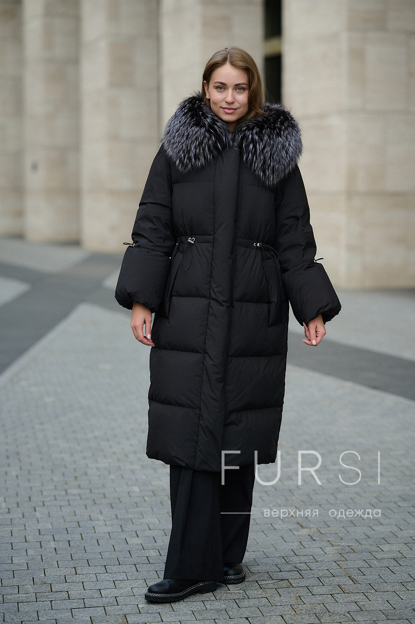 Пуховик с рукавами "фонарик", черный с мехом чернобурки